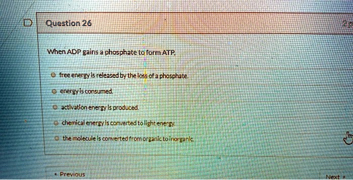 Solved Question 26 When Adp Gains Phosphate To Form Atp Free Energy Is Released By The Loss Ofa Phosphate Enerzyis Consumed Activation Energy Is Produced Chemical Enerzy Is Converted To Light Eners The